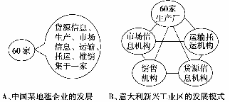 (4)从图一中的A、B两幅图上可以看出,我国某乡镇企业的发展与意大利新工业区的发展模式不同,具体体现在:我国某乡镇 ______