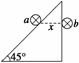 如图所示,有两根长为L、质量为m的细导体棒a、b,a被水平放置在倾角为45°的光滑斜面上, b被水平固定在与a在同一水平面的另一位置,且a、b平行,它们之间的距离为x.当两细棒中均通以电流强度为I的同向电流时,a恰能在斜面上保持静止,则b的电流在a处产生的磁场的磁感应强度的说法错误的是 ( )