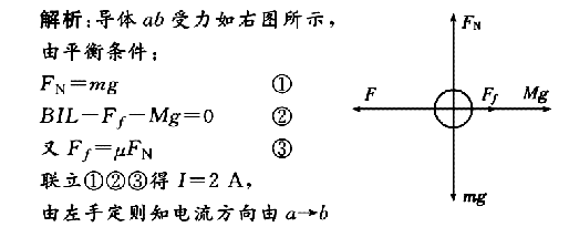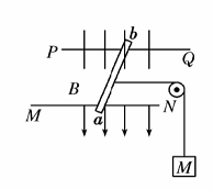 11、如图所示,PQ和MN为水平、平行放置的金属导轨,相距1m,导体棒ab跨放在导轨上,棒的质量为m=0.2kg,棒的中点用细绳经滑轮与物体相连,物体的质量M=0.3kg,棒与导轨的动摩擦因数为0.5,匀强磁场的磁感应强度B=2T,方向竖直向下,为了使物体匀速上升,应在棒中通入多大电流?方向如何?(g=10m/s2)