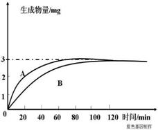 44. (8分)右图A曲线表示最适温度、最适pH条件下,人体唾液淀粉酶作用于一定量的淀粉,生成物量与反应时间的关系图,请回答下列问题: