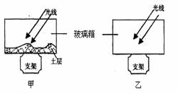 某学校地理兴趣小组做了如下实验:做两个相同规格的玻璃箱(如图5),甲底部放一层土,中午同时把两个玻璃箱放在日光下,十五分钟后,同时测玻璃箱里的气温,结果发现底部放土的比没有放土的足足高了3℃。回答9-10题。