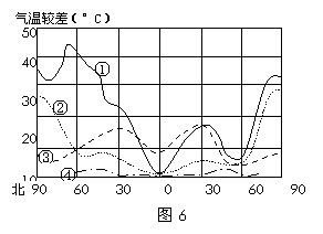 图6为海洋与陆地气温年较差、日较差随纬度的变化曲线图,①②③④分别表示陆地或海洋的气温年较差和日较差变化曲线,完成11-12题。