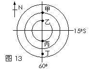 图13表示某时刻太阳高度分布状况,圆圈为等太阳高度线,自里向外外依次为60°、30°、0°,据此完成26-27题。