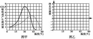 (3)根据甲图,在乙图的坐标上画出植物在15-60 ℃范围内的净光合作用速率的变化曲线。