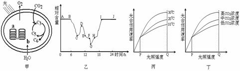 44.(14分)图甲为叶绿体结构与功能示意图,图乙表示一株小麦叶片细胞内C3相对含量在一天24小时内(有时多云)的变化过程,图丙和丁表示不同外界环境因素对光合速率的影响,请据图分析: