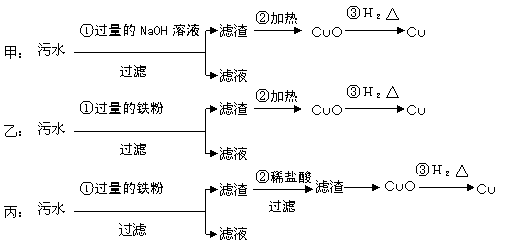 [解析]结合污水中Mg2+、Fe3+、Cu2+、Hg2+四种离子的性质,甲方案中滤渣中有Mg(OH)2、Cu(OH)2、Fe(OH)3及Hg(OH)2,加热得氧化物为CuO、MgO、Fe2O3及HgO,通入H2加热后Cu中含有Fe及MgO。乙方案中加过量的铁粉后滤渣中含有铜粉、铁粉及单质汞,最后Cu中含有Fe。方案丙中加过量的铁粉后滤渣中含有铜粉、铁粉及单质汞,再滴加稀盐酸除去铁粉,后滤渣只有铜粉及汞,通入H2并加热知得到纯净的铜粉,加热时汞也挥发成汞蒸气,对环境造成污染,为防止污染,将汞蒸气冷凝回流,回收变废为宝。