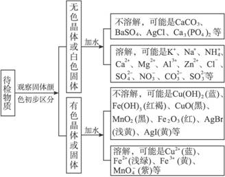 常见物质的检验方法,一方面是根据物质的物理性质(如颜色、溶解性、溶解热效应等)直接检验,另一方面是根据物质化学性质,使被检验物质与加入的试剂作用,产生某种特殊现象(如:生成气体、沉淀,产生特殊颜色等),从而确定该物质的存在。