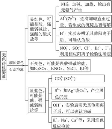 (1)离子的检验。检验的原理是依据离子的特征反应现象如呈现特殊颜色变化、生成沉淀、生成气体等。十种常见离子的检验方法是:K+、Na+用焰色反应;