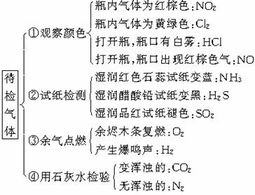 由于气体贮存困难,使用时易扩散,故检验中要尽可能使用物理性质加以检验,即使使用化学方法,尽可能多用试纸。可按下列顺序检验: