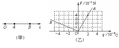 8如图(甲)所示,在x轴上有一个点电荷Q(图中未画出),O、A、B为轴上三点。放在A、B两点的检验电荷受到的电场力跟检验电荷所带电荷量的关系如图5(乙)所示。以x轴的正方向为电场力的正方向,则