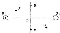 11、如下图所示,Q1和Q2是等量异种点电荷,M、N是两个点电荷连线的垂直平分线上的两点.将正电荷q从无限远处沿MN线移到电场中,电场力对电荷q做的功为 .取无限远处的电势为零,那么A点的电势为 值,B点的电势为 值(填正、负或零).