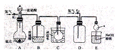 下图为某实验者设计的验证银圆(银和铜的合金)完全溶解于一定量的浓硝酸后生成NO2气体中含有NO的实验装置图。常温时,NO2与N2O4同时存在;在低于0℃时,几乎只有无色的N2O4的晶体存在。