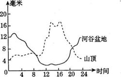 读某地区山顶与河谷盆地降水量的某日变化曲线图,完成下面11题。