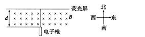 地球磁场对电视机显像管中电子束有影响.如图所示,电子枪到荧光屏的距离为d,显像管的取向使电子水平地由南向北运动,该处地球磁场的竖直分量向下,大小为B,电子枪中电子的加速电压为U.仅考虑地磁场对电子束的作用,则当电子束在南北方向上通过距离d时,以下关于电子束偏转的说法中正确的是 ( )