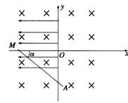 4.如图所示,在地面附近,坐标系xOy在竖直平面内,空间有沿水平方向垂直于纸面向里的匀强磁场,磁感应强度大小为B,在x<O的空间内还有沿x轴负方向的匀强电场.一个质量为m的带电荷量为g的油滴途经图中M点(-a,O)(a>O),沿着与水平方向成a角斜向下做匀速直线运动,经A点进入x>0的区域.求: