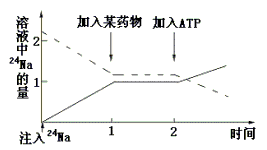 5. 科学家在研究钠通过细胞膜的运输方式时,做了下述实验:先向枪乌贼神经纤维里注入微量的放射性同位素24Na,注入的总量为2.2,不久可测得神经纤维周围溶液中存在24Na。如果在神经纤维膜外溶液中先后加入某药物和ATP,测得周围溶液中24Na的量如下图实线所示。据图作出下列推断,错误的是……( )