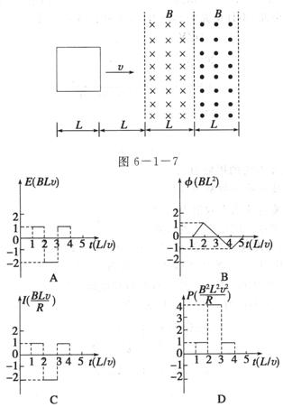 [例1]如图所示,存在有界匀强磁场,磁感应强度大小均为B,方向分别垂直纸面向里和向外,磁场宽度均为L,在磁场区域的左侧相距为L处,有一边长为L的正方形导体线框,总电阻为R,且线框平面与磁场方向垂直.现使线框以速度”匀速穿过磁场区域.以初始位置为计时起点,规定逆时针方向时的电流和电动势方向为正,B垂直纸面向里时为正,则以下关于线框中的感应电动势、磁通量、感应电流和电功率的四个图象描述不正确的是