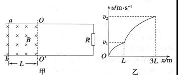 (1)若ab杆在恒力作用下由静止开始向右运动3L距离,其速度-位移的图象如图乙所示(图中所示量为已知量).求此过程中电阻R上产生的焦耳热Q.及ab杆在刚要离开磁场时的加速度大小a.