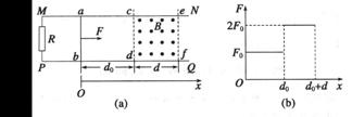 [强化练习3]如图(a)所示,光滑的平行水平金属导轨MN、PQ相距l,在M点和P点间连接一个阻值为尺的电阻,在两导轨间cdfe矩形区域内有垂直导轨平面竖直向上、宽为d的匀强磁场,磁感应强度为B.一质量为m、电阻为r、长度也剐好为l的导体棒ab垂直搁在导轨上,与磁场左边界相距d0.现用一个水平向右的力F拉棒ab,使它由静止开始运动,棒ab离开磁场前已做匀速直线运动,棒ab与导轨始终保持良好接触,导轨电阻不计,F随ab与初始位置的距离x变化的情况如图(b)所示,F0已知.求: