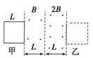 3.如图所示,两个相邻的匀强磁场,宽度均为L,方向垂直纸面向外,磁感应强度大小分别为B、2B.边长为L的正方形线框从位置甲匀速穿过两个磁场到位置乙,规定感应电流逆时针方向为正,则感应电流i随时间t变化的图象是 ( )