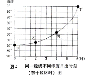 图4为某日观测到的同一经线上不同纬度的日出时刻(东十区区时)。此时,东十区区时为12时。读图回答10-13题。