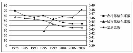 材料一: 1978-2007年我国基尼系数和恩格尔系数变化表