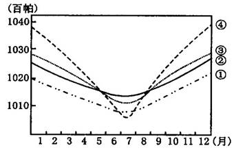 36.下图中绘出了伦敦、乌兰巴托、莫斯科、华盛顿四城市的气压年变化曲线,其中代表乌兰巴托的气压年变化曲线是