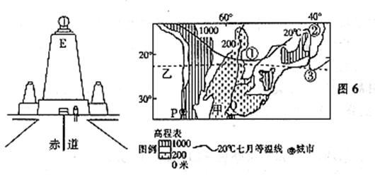 (1)左图中游客在位于78.5°W,高10米的赤道纪念碑处看到日出,此刻,北京时间为