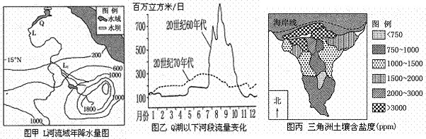 (2)读图乙,并结合图甲,分别说明Q湖以下河段在20世纪60年代与70年代流量变化的主要特点,并简析出现明显差异的主要原因。
