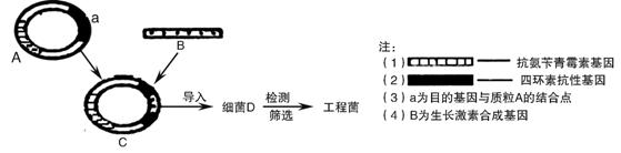 21. 下图是将人的生长激素基因导入细菌D细胞内,产生“工程菌”的示意图。所用的载体为质粒A。若已知细菌D细胞内不含质粒A,也不含质粒A上的基因,质粒A导入细菌后,其上的基因能得到表达。能表明目的基因已与载体结合,并被导入受体细胞的是