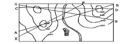13.下面的地形剖面图(下图)是根据等高线地形图(上图)或的某条剖面线画出的,它是 ( )