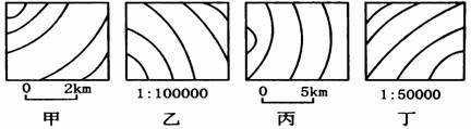 C.四幅图的地势均为东北高西南低 D.甲图的比例尺是丙图的3倍