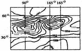 读北半球某时刻海洋、陆地海平面气压分布示意图分析图中信息回答17-18题。