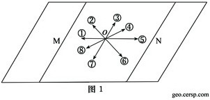 图1示意某一等高面。M、N为等压线,其气压值分别为PM、PN,M、N之间的气压梯度相同。①-⑧是只考虑水平受力,不计空气垂直运动时,O点空气运动的可能方向。回答18-20题。