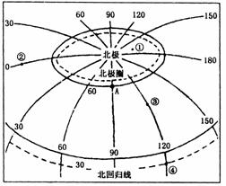 ⑵图中①、②、③、④四地中,位于西半球的是____地,有阳光直射的是____地。