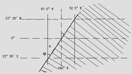 若右图中A=66°34′,则此日,甲地附近的我国最大海港的一艘轮船6∶00起航驶向美国的旧金山港(西八区),途中需航行15天整,则到达目的地的时间为: