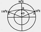 如右图所示。此时ABC弧线上的太阳高度角为0°,某学生正在距B地正南方2775km的某地观浏到北极星的仰角为42°。完成13-14题。