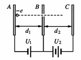 (10分)如图所示,在平行金属板AB间和BC间分别由电源提供恒定的电压U1和U2,且U2>U1。在A板附近有一电子,质量为m,电荷量为-e,由静止开始向右运动,穿过B板的小孔进人BC之间,若AB间距为d1,BC间距为d2。求: