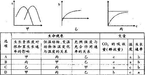 14.下表是对甲、乙、丙图所示的生命现象及a、b、c所表示变量的分析,正确的一组为( D )