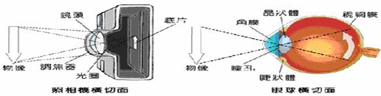 被注:瞳孔起到了照片机中光圈的作用,当光强时,瞳孔自动缩小;光弱时,瞳孔自动放大.当物体的像呈现在视网膜时,视神经就把视觉信号传送到大脑中. |
