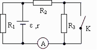 15.在如图所示的电路中,电阻R1=12Ω,R2=8Ω,R3=4Ω。当电键K断开时,电流表示数为0.25A,当K闭合时电流表示数为0.36A,则电源的电动势和内电阻分别多大?