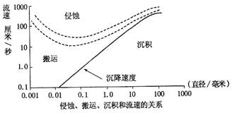下图中横坐标表示物质颗粒的直径,纵坐标表示流速与沉降速度。回答9~10题。