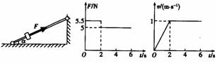 例5.固定光滑细杆与地面成一定倾角,在杆上套有一个光滑小环,小环在沿杆方向的推力F作用下向上运动,推力F与小环速度,随时间变化规律如图所示,取重力加速度g=10m/s2。 求:⑴小环的质量m;⑵细杆与地面间的倾角