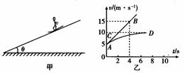 例8.质量为40kg的雪撬在倾角θ=37°的斜面上向下滑动如图甲所示,所受的空气阻力与速度成正比。今测得雪撬运动的v-t图象如图乙所示,且AB是曲线的切线,B点坐标为(4,15),CD是曲线的渐近线。试求空气的阻力系数k和雪撬与斜坡间的动摩擦因数