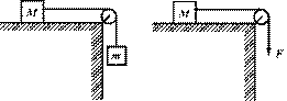 例1.如图所示,一个质量为M的物体放在光滑的水平桌面上,当用20N的力F通过细绳绕过定滑轮拉它时,产生2m/s2的加速度.现撤掉20N拉力,而在细绳下端挂上重为20N的物体m,如图,则物体M的加速度为