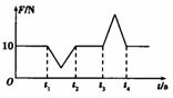 『巩固』某实验小组,利用DIS系统观察超重和失重现象.他们在学校电梯房内做实验,在电梯天花板上固定一个力传感器,测量挂钩向下,并在钩上悬挂一个重为10N的钩码,在电梯运动过程中,计算机显示屏上显示出如图所示图象,以下根据图象分析所得结论错误的是( D )