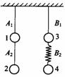 例1.四个质量均为m的小球,分别用三条轻绳和一根轻弹簧连接,处于平衡状态,如图所示,现突然迅速剪断轻绳A1B1,让小球下落,在剪断轻绳的瞬间,设小球1、2、3、4的加速度分别用a1a2a3a4表示,则      (  A )
