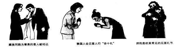 9.下图,中国藏族同胞为尊贵的客人献哈达,泰国人会见客人行“合十礼”,拥抱是欧美常见的见面礼节。由此可见