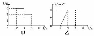 放在水平地面上的一物块,受到方向不变的水平推力F的作用,F的大小与时间t的关系如图甲所示,物块速度v与时间t的关系如图乙所示。取重力加速度g=10 m/s2。由此两图线可以得出