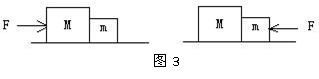 3.如图3所示,在光滑水平面上,有两个相互接触的物体,若M>m,第一次用水平力F由左向右推M,两物体间的作用力为N1,第二次用同样大小的水平力F由右向左推m,两物体间的作用力为N2,则( C )